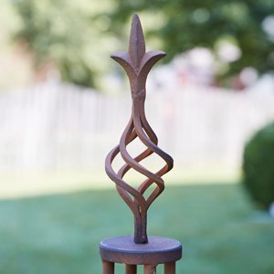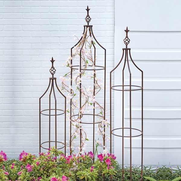 Add a rustic, sculptural element to your garden with our set of topiaries. Detailed with classic style, each feature a finial. Use in a garden with flowering vines, tomato plants, or rosebushes. Topiaries nest together for storage. Medium topiary measures 11¾'' dia. x 64''H and smallest topiary measures 9¾'' dia. x 53¼''H. This item ships by motor freight and is not available for our dropship program. Additional freight charges may apply. Orders containing freight items must reach a $1000 minimum order.